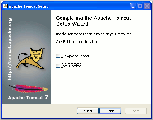- Unclick "Run Apache Tomcat" and "Show Readme", and Finish.