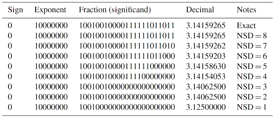 Figure 1: The value of Pi expressed as a 32-bit floating point number, with different levels of quantization applied, from Number of Significant Digits equal to 8 (no quantization), to 1 (maximum quantization). The least significant bits of the significand are replaced with zeros, to the extent possible, while preserving the desired number of significant digits. In this example the Bit Grooming quantization algorithm is used.