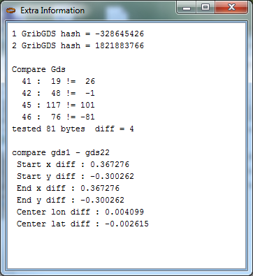 What we see is the “GRIB files” are actually composed of message that are defined on very different grids. By examining these files in ToolsUI, we can see there are indeed two GDS. It appears that one GDS is associated with more “primary” modeled output; the second GDS appears to be associated with “derived” parameters.