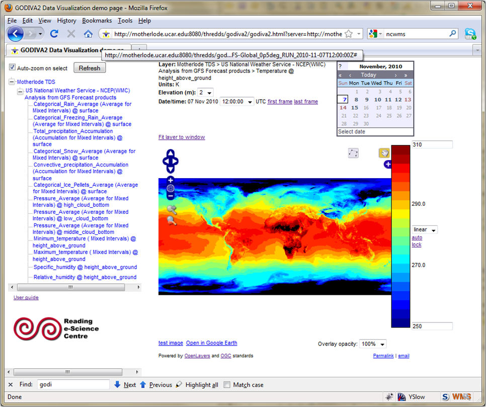 The TDS WMS implementation uses the edal-java software developed by Jon Blower (Reading E-Science Center at the University of Reading). It supports OGC Web Map Service (WMS) versions 1.3.0 and 1.1.1. Interacting with the WMS service included with the TDS should be the same as ncWMS (for more information, see the Usage section of the ncWMS User Guide.
